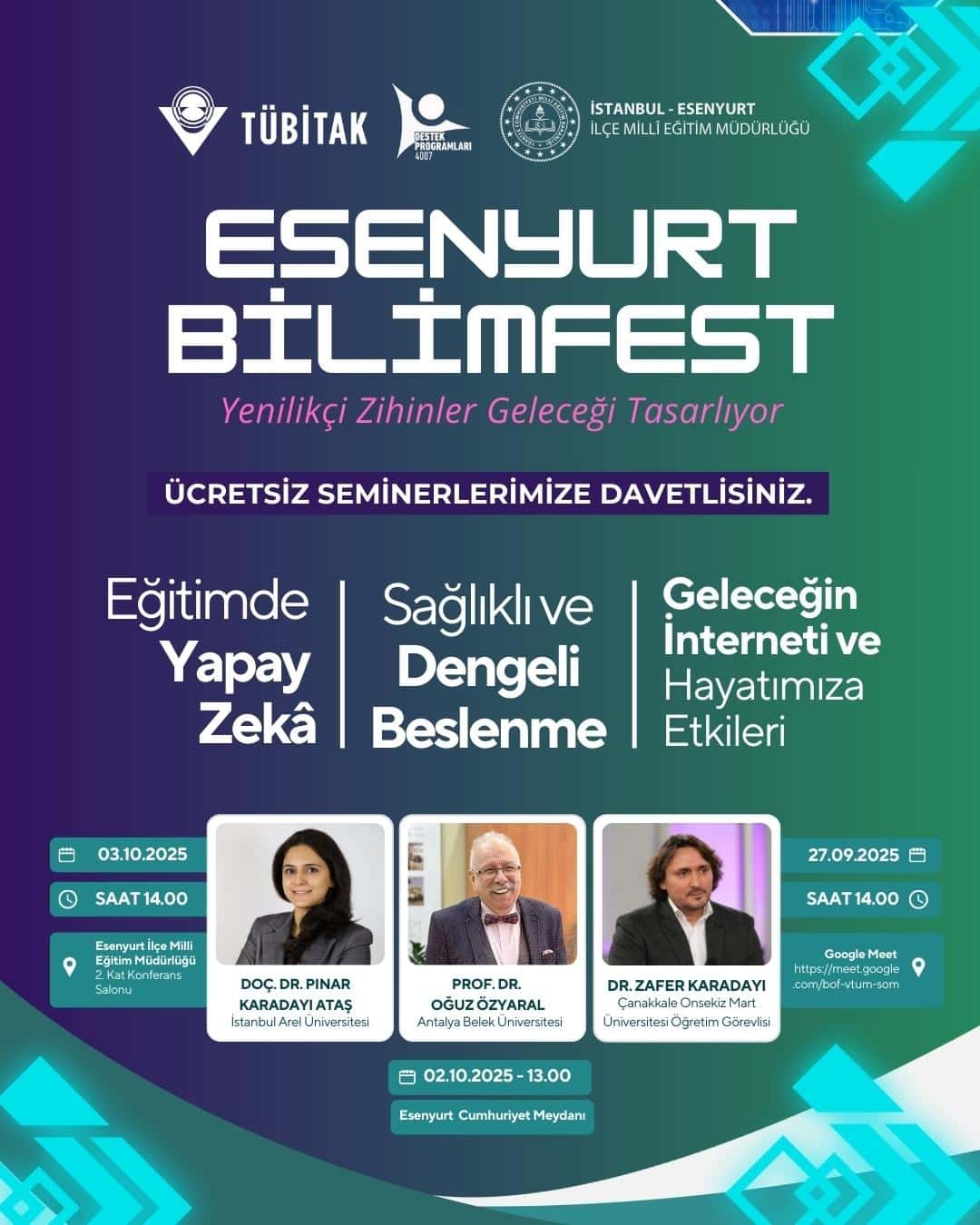 "ESENYURT BİLİMFEST Yenilikçi Zihinler Geleceği Tasarlıyor" adlı TÜBİTAK 4007 projemiz kapsamında planladığımız konferans serimizin ilki bu cumartesi başlıyor.